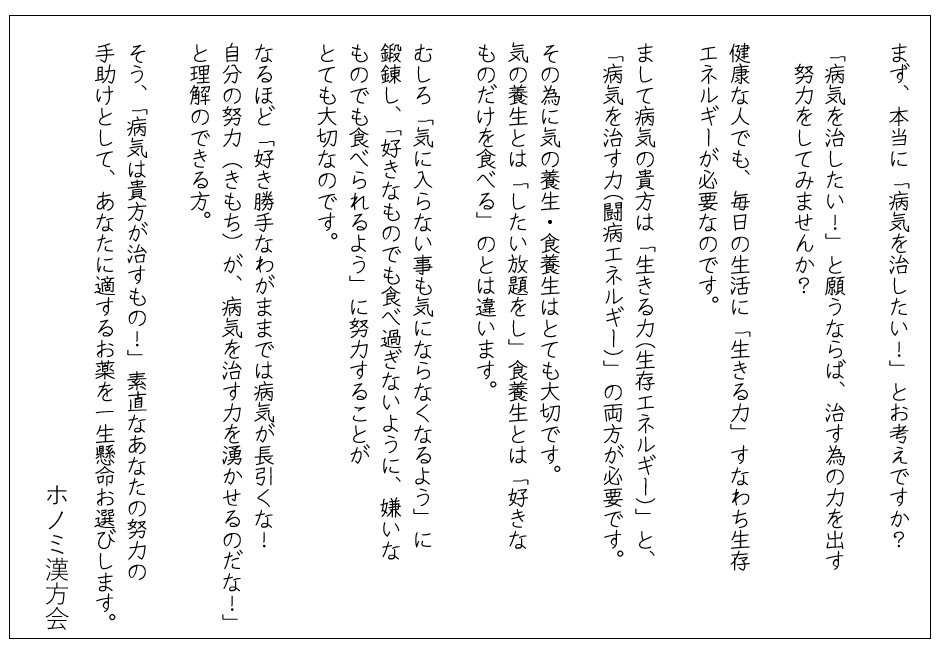 当店の漢方療法は、ホノミ漢方薬医学に基づくホノミ選薬システムを用いた